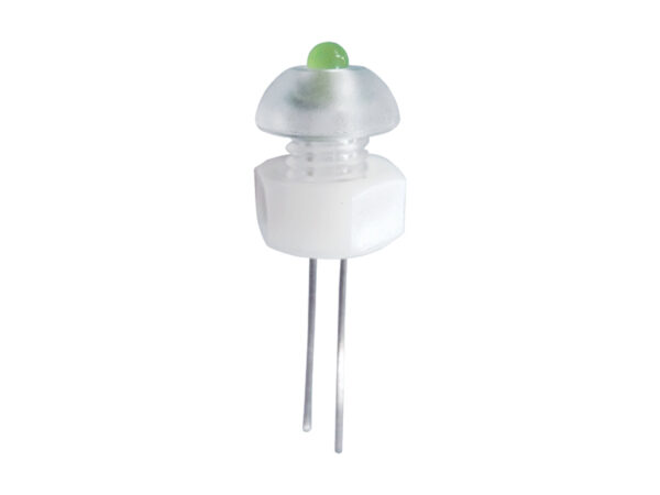 Mushroom Front Mount Metric M6 Screw LED holder assembly for 3mm LED (T-1). Material Polycarbonate. Including insert (part# LELG-1B) to keep leads separated and Nylon Metric M6 Nut (part# M-6)