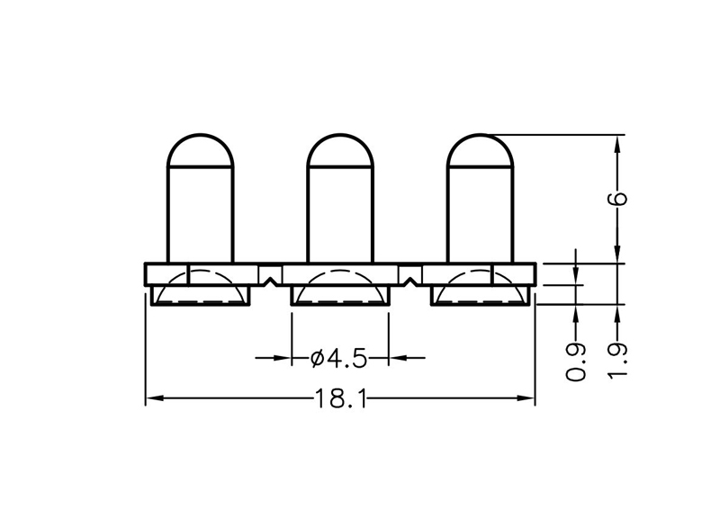 Triple Vertical Light Pipe Flat 3.0mm Domed Lens size. Centerline 6.5mm. Lenght 18.1mm.Material Polycarbonate. Helps protect sensitive components from ESD