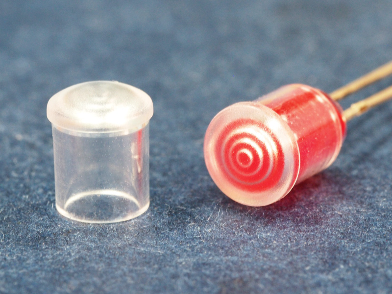 Push-In Fresnel Lens Cap for 5mm LED. Transparent Polycarbonate. Mounting hole Ø 6.3mm. Friction Lock