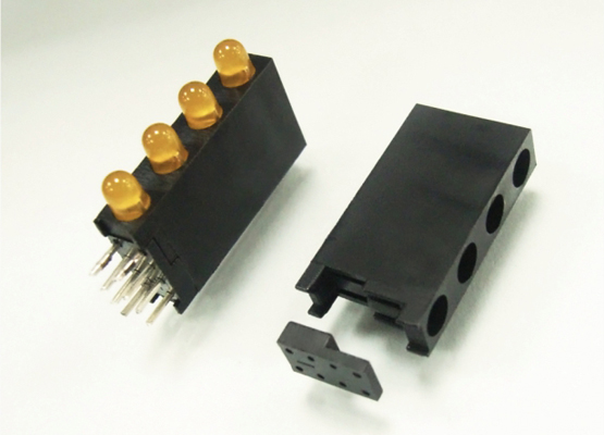 Right Angled 4 stack LED holder for LED size 3mm(T-1). Centerline bottom LED 2.54mm. Distance between LED’s 5.08mm. LED’s shown for Demo not included in holder