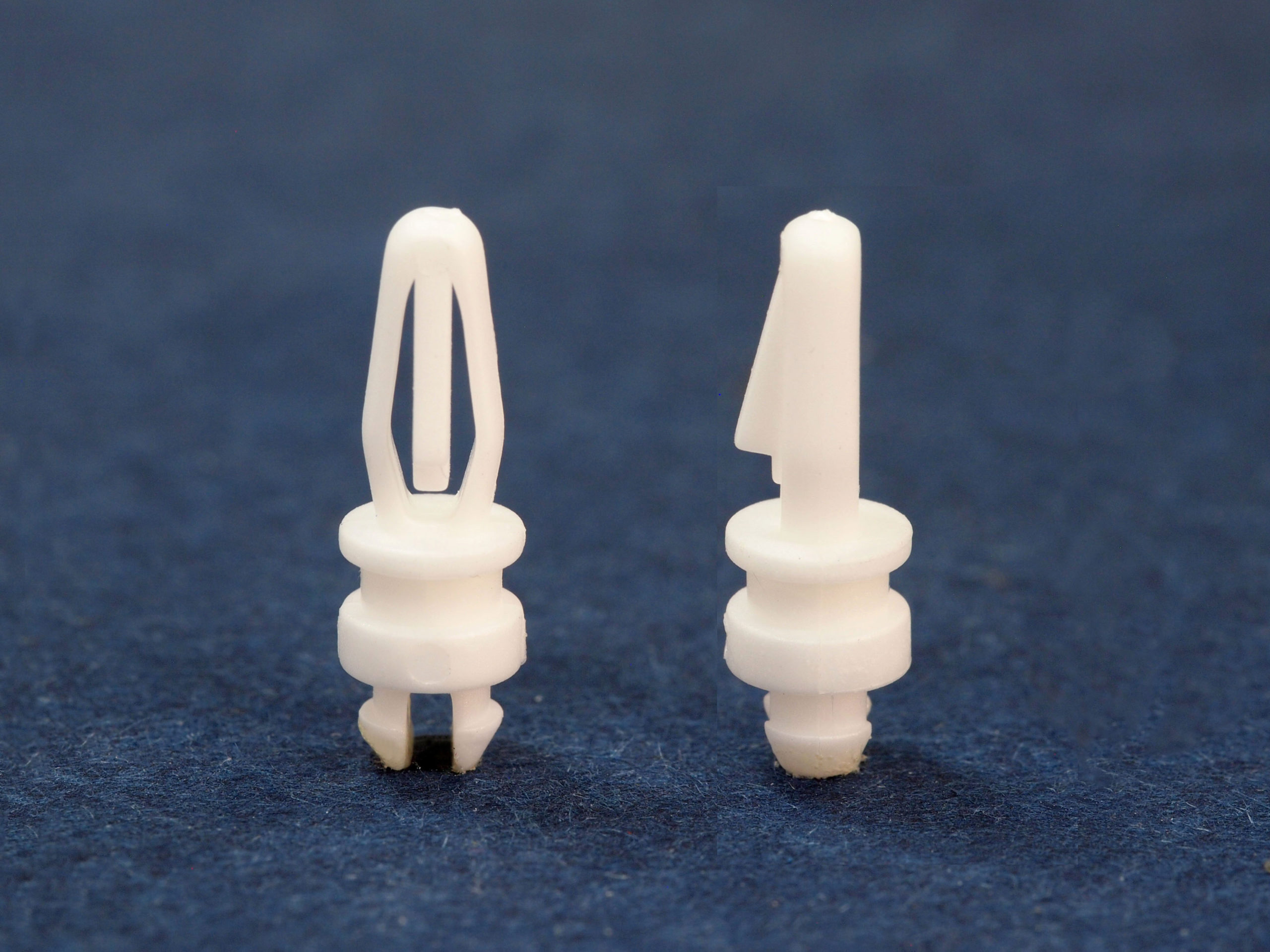 Dual lock support post. Bayonet snap fit for a top hole of 3.2 mm and a two prong lock design for a chassis hole of 3.2 mm. Spacer length is 4 mm.