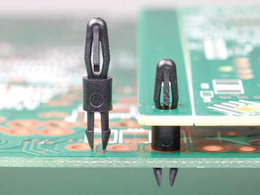Dual lock support post. Bayonet snap fit for a top hole of 3 mm and a two prong lock design for a chassis hole of 3 mm. Standoff height is 6 mm.