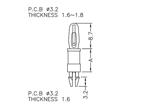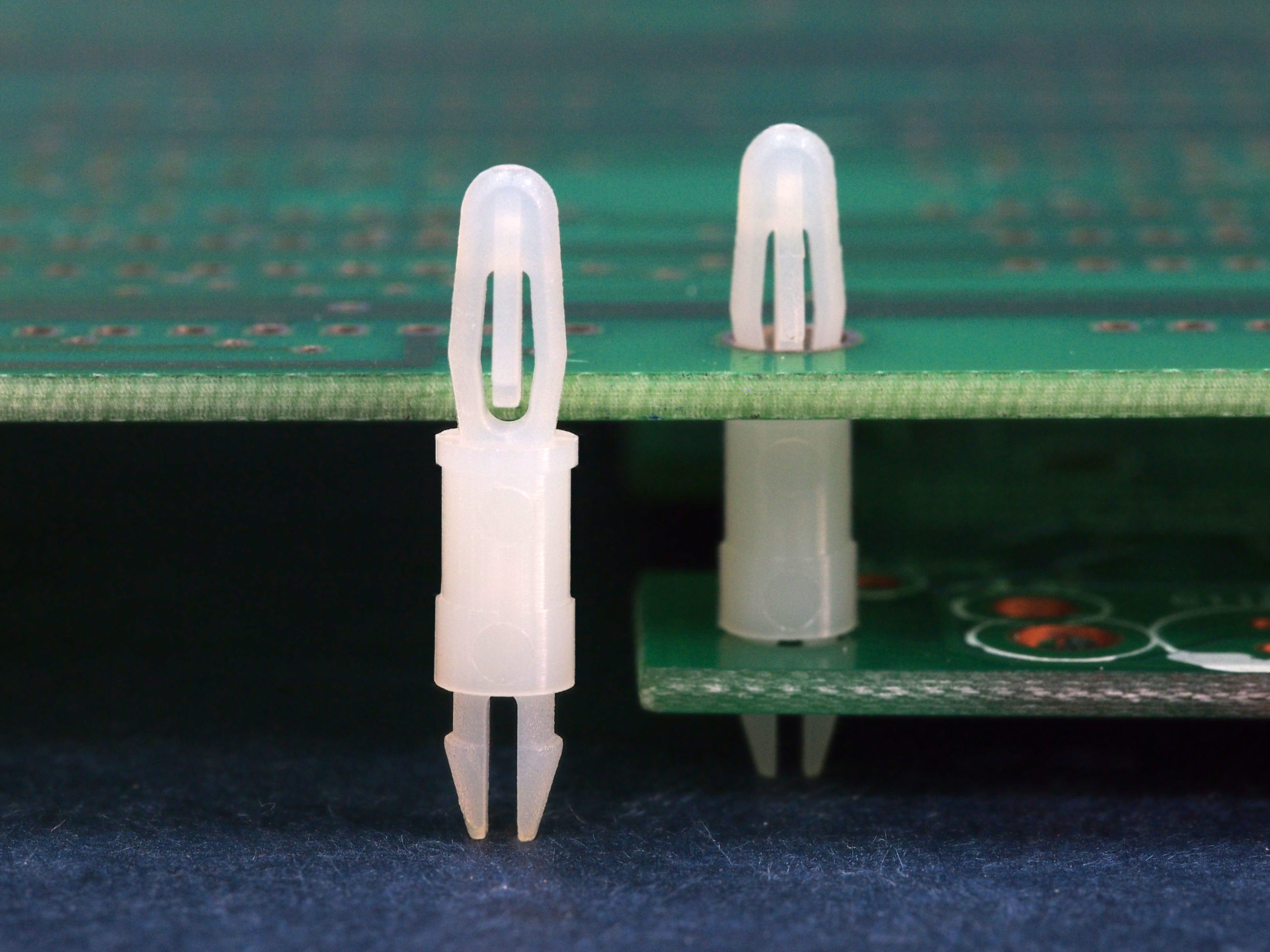 Dual lock support post. Bayonet snap fit for a top hole of 3.2 mm and a two prong lock design for a chassis hole of 3.2 mm. Spacer length is 15.9 mm.