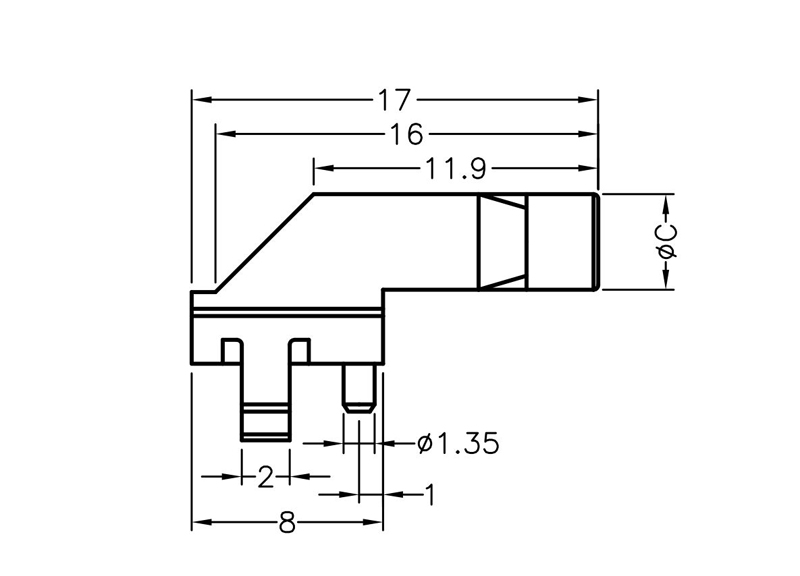 Right Angled 90° PCB Snap-Fit Mount single station Light Pipe for SMD LED. Material Polycarbonate. Round Flat Lens diameter Ø4.0mm.