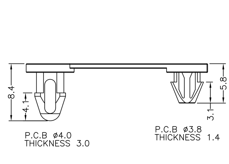 PCB Hinge snap lock. Snap lock 1 dia.Ø4.0mm.Thickness 3.0mm. Snap lock 2 dia.Ø3.8mm.Thickness 1.4mm. Material Nylon 66. Color Natural/Black