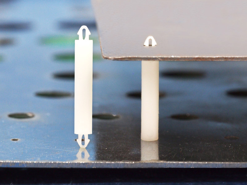 Dual locking support post. Snap lock teardrop design allows fixation into small holes. Top hole 2 mm. Bottom hole 2 mm. Length 19 mm.