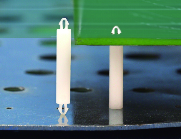 Dual locking support post. Snap lock teardrop design allows fixation into small holes. Top hole 2 mm. Bottom hole 2 mm. Length 19 mm.