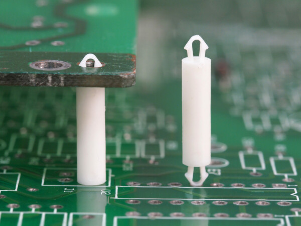 Dual locking support post. Snap lock teardrop design allows fixation into small holes. Top hole 2 mm. Bottom hole 2 mm. Length 12.9 mm.