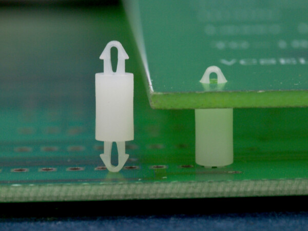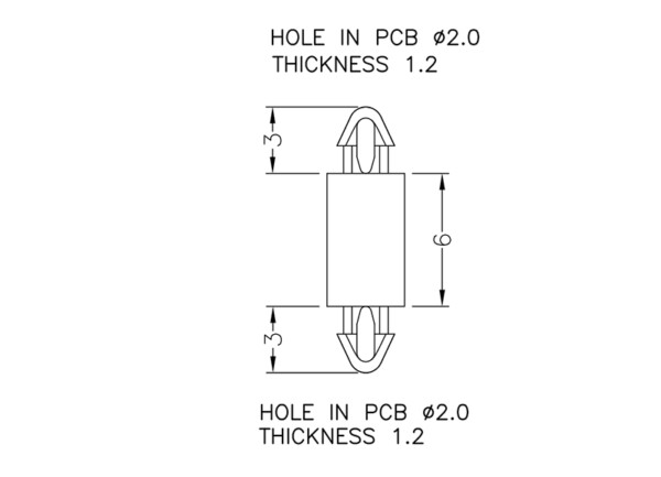 Dual locking support post. Snap lock teardrop design allows fixation into small holes. Top hole 2 mm. Bottom hole 2 mm. Length 6 mm.