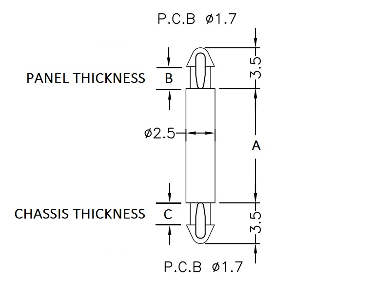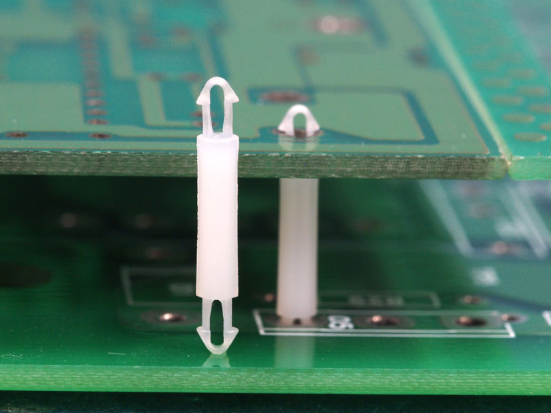 Dual locking support post. Snap lock teardrop design allows fixation into small holes. Top hole 1.7 mm. Bottom hole 1.7 mm. Length 9.8 mm.
