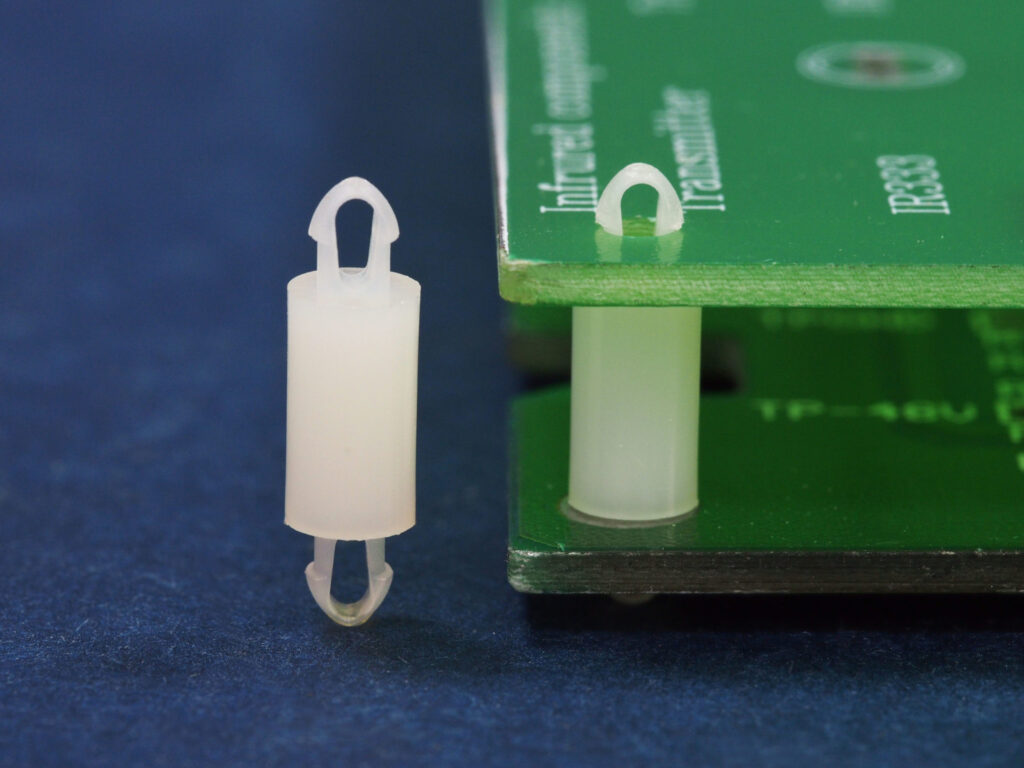 Dual locking support post. Snap lock teardrop design allows fixation into small holes. Top and bottom hole 2.5 mm. Spacer length 3 mm.