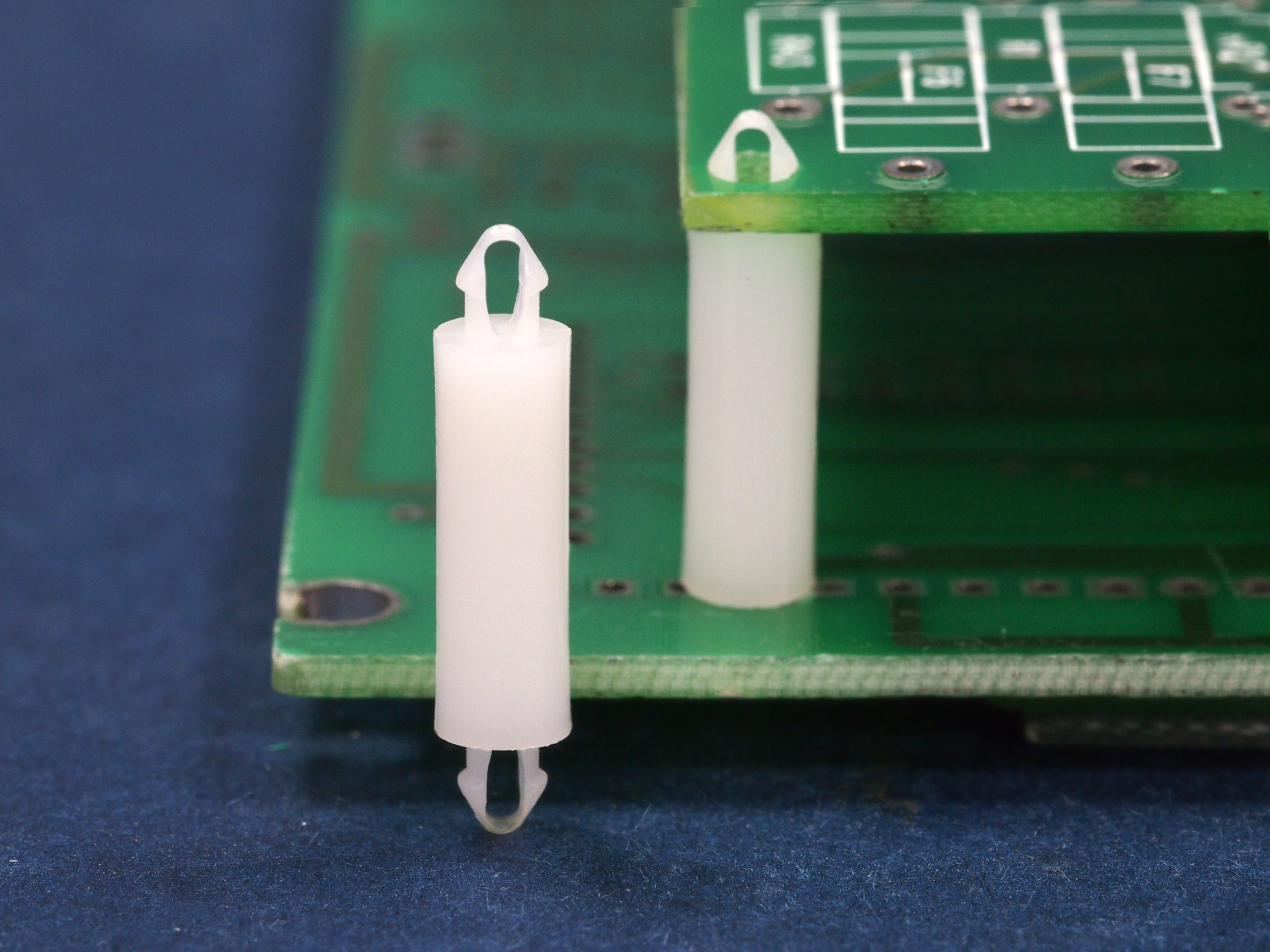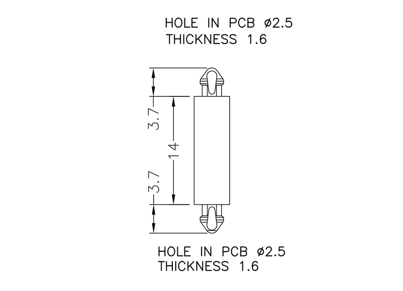Dual locking support post. Snap lock teardrop design allows fixation into small holes. Top and bottom hole 2.5 mm. Spacer length 14 mm.