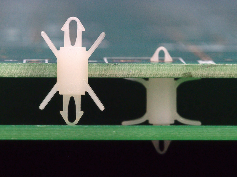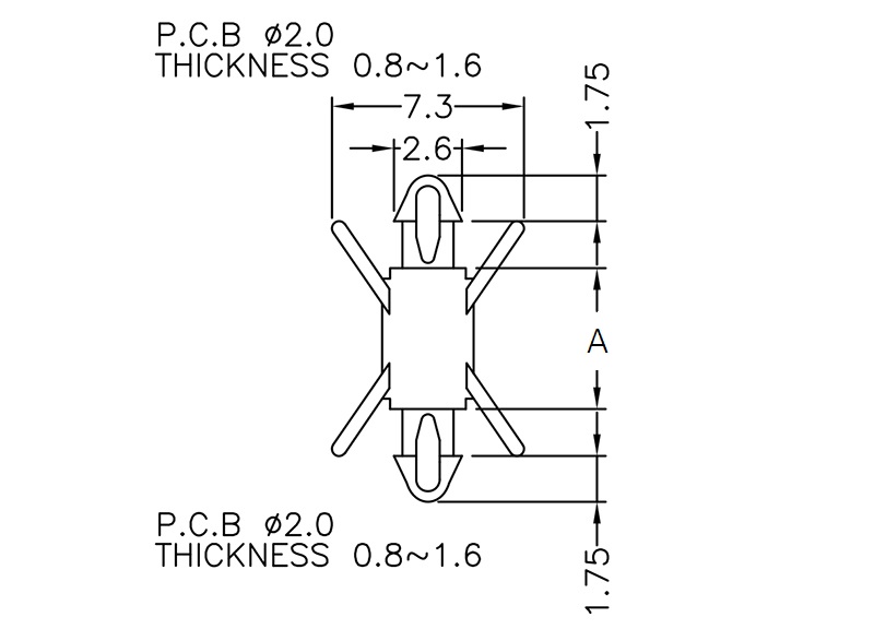 Dual locking support snap lock with tension wings. For a top and bottom hole of 2 mm. Standoff height is 5.4 mm.