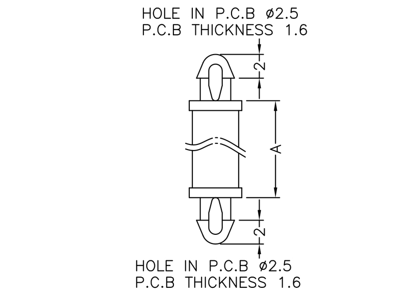 Dual locking support post. Snap lock teardrop design allows fixation into small holes. Top and bottom hole 2.5 mm. Standoff height 12.7 mm.