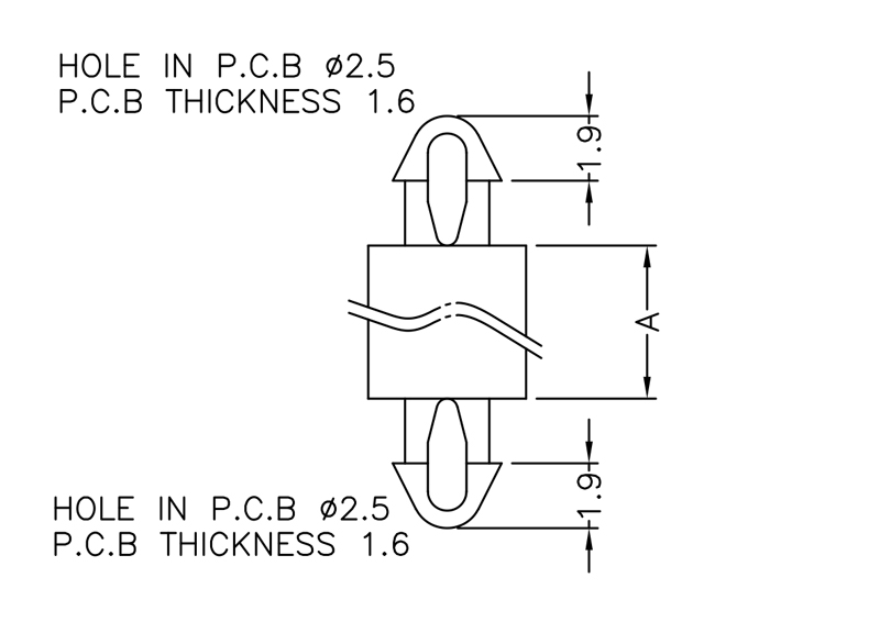Dual locking support post. Snap lock teardrop design allows fixation into small holes. Top and bottom hole 2.5 mm. Spacer length 2 mm.