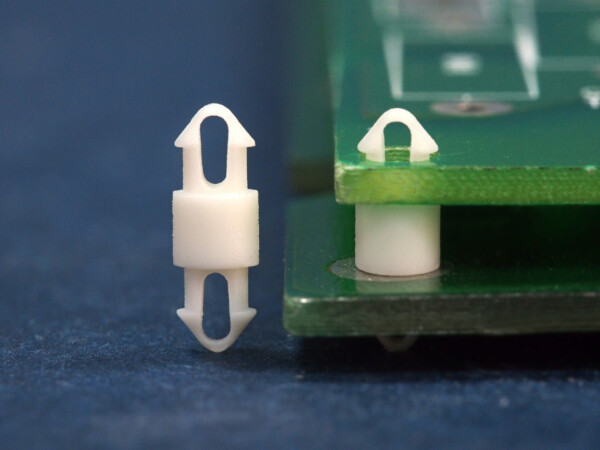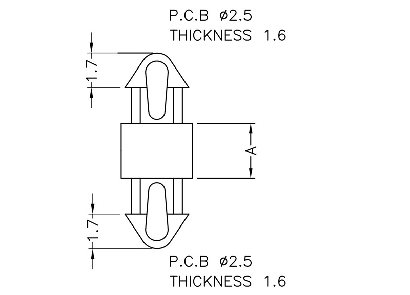 Dual locking support post. Snap lock teardrop design allows fixation into small holes. Top and bottom hole 2.5 mm. Spacer length 2.7 mm.