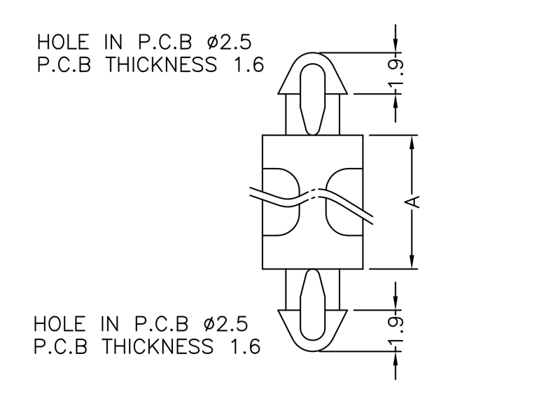 Dual locking support post. Snap lock teardrop design allows fixation into small holes. Top and bottom hole 2.5 mm. Spacer length 7.5 mm.
