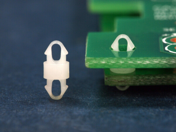 Dual locking support post. Snap lock teardrop design allows fixation into small holes. Top and bottom holes are 2.6 mm. Spacer length 2.2 mm.