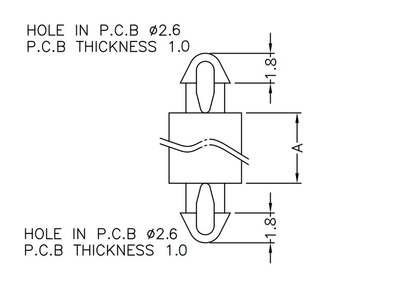 Dual locking support post. Snap lock teardrop design allows fixation into small holes. Top and bottom holes are 2.6 mm. Standoff height 2.2 mm.
