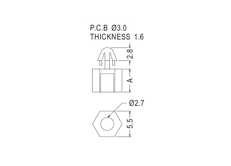 Snap lock hexagonal self tapping spacer with a pilot hole of 2.7 mm and an arrowhead for a 3 mm mounting hole. Standoff height 5 mm.