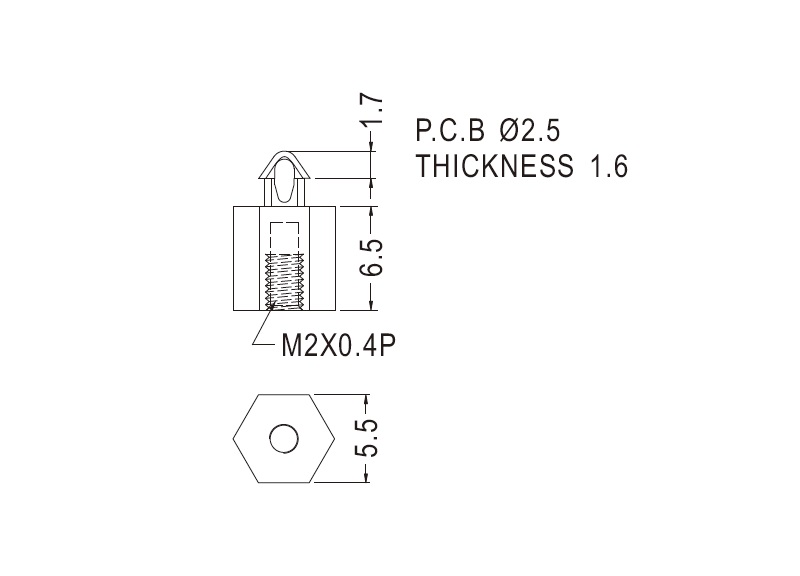 Snap lock hexagonal M2 spacer provided with an arrowhead for a 2.5 mm mounting hole. Spacer length 6.5 mm.