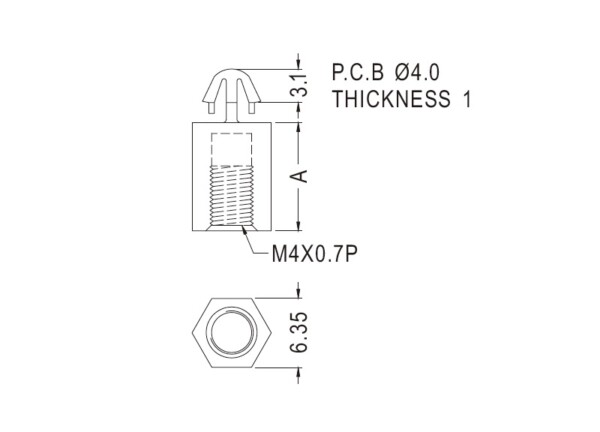Snap lock hexagonal M4 spacer provided with an arrowhead for a 4 mm mounting hole. Spacer length 10 mm.