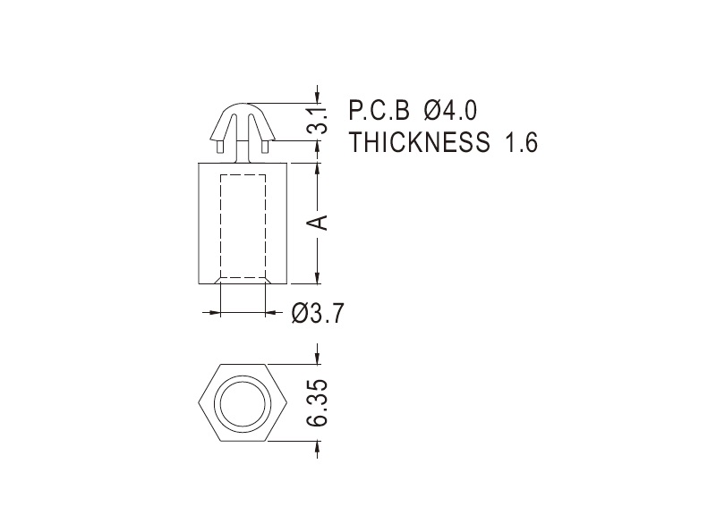 Snap lock hexagonal self tapping spacer with a pilot hole of 3.7 mm and an arrowhead for a 4 mm mounting hole. Spacer length 5 mm.