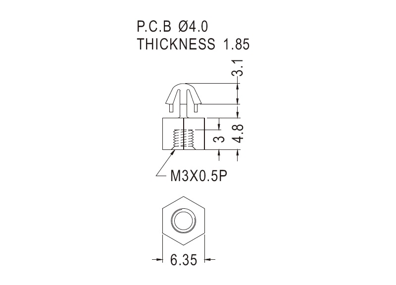Snap lock hexagonal M3 spacer provided with an arrowhead for a 4 mm mounting hole. Spacer length is 4.8 mm.