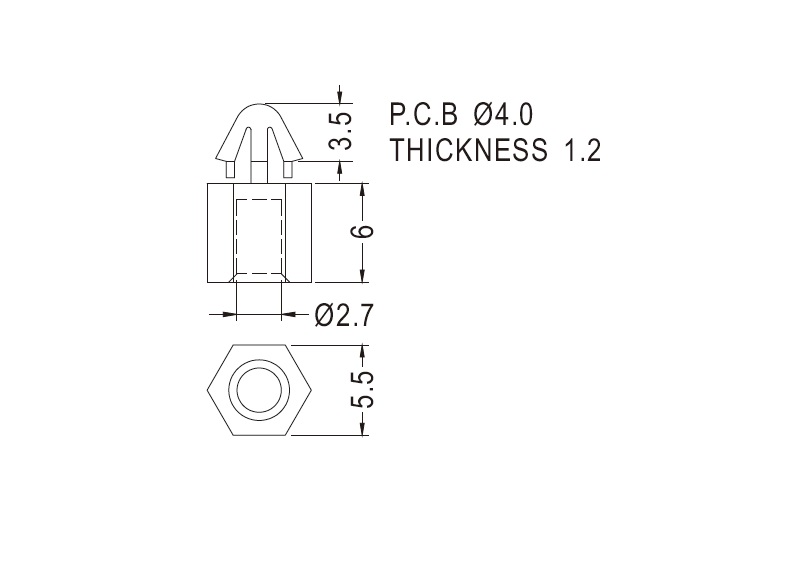 Snap lock hexagonal self tapping spacer with a pilot hole of 2.7 mm and an arrowhead for a 4 mm mounting hole. Spacer length 6 mm.