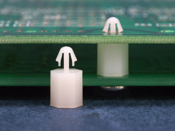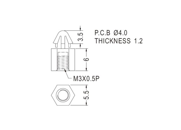 Snap lock hexagonal M3 spacer provided with an arrowhead for a 4 mm mounting hole. Spacer length 6 mm.
