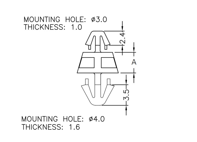 Dual snap lock support. Arrowhead design on both sides fits top hole of 3 mm and bottom hole of 4 mm. Standoff height is 3.5 mm.