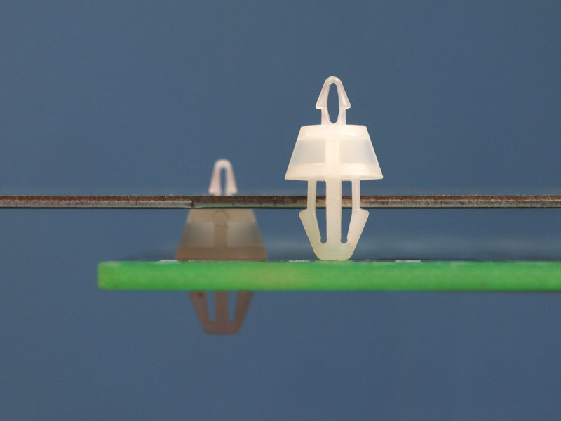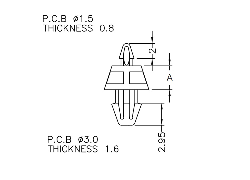 Dual snap lock support. Snap lock teardrop fits in a 1.5 mm panel hole and an arrowhead fits a chassis hole of 3 mm. Standoff height is 3.2 mm.