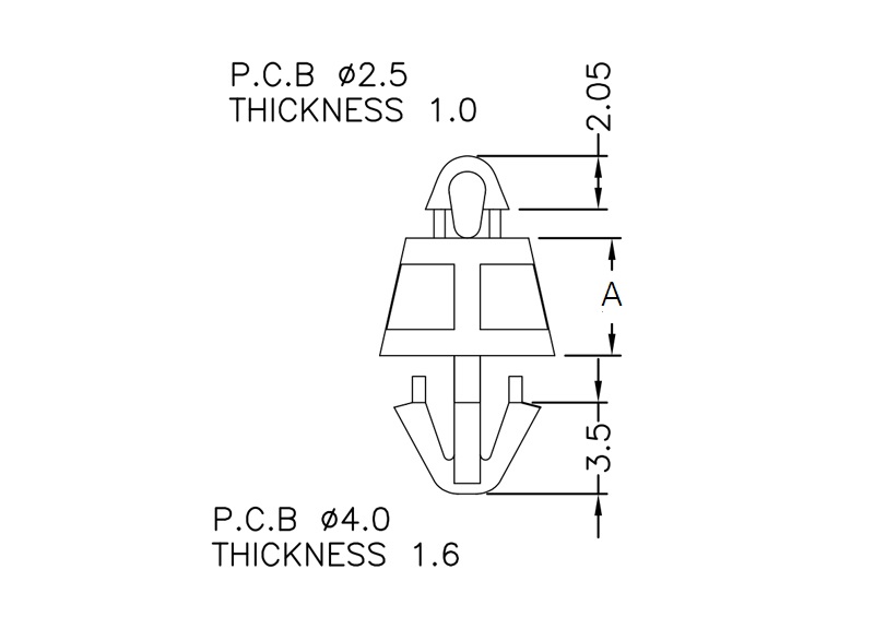 Dual snap lock support. Snap lock teardrop fits in a 2.5 mm panel hole and an arrowhead fits a chassis hole of 4 mm. Standoff height is 4.5 mm.
