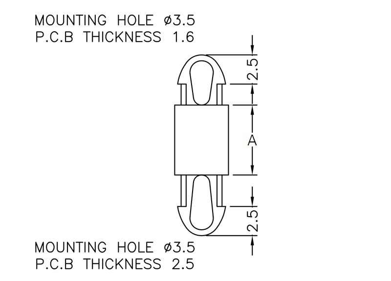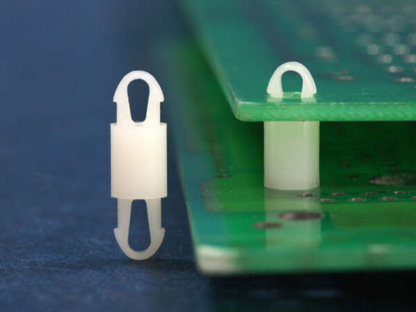 Dual locking support post. Snap lock teardrop design allows fixation into small holes. Top and bottom hole 3.5 mm. Spacer length 6 mm.