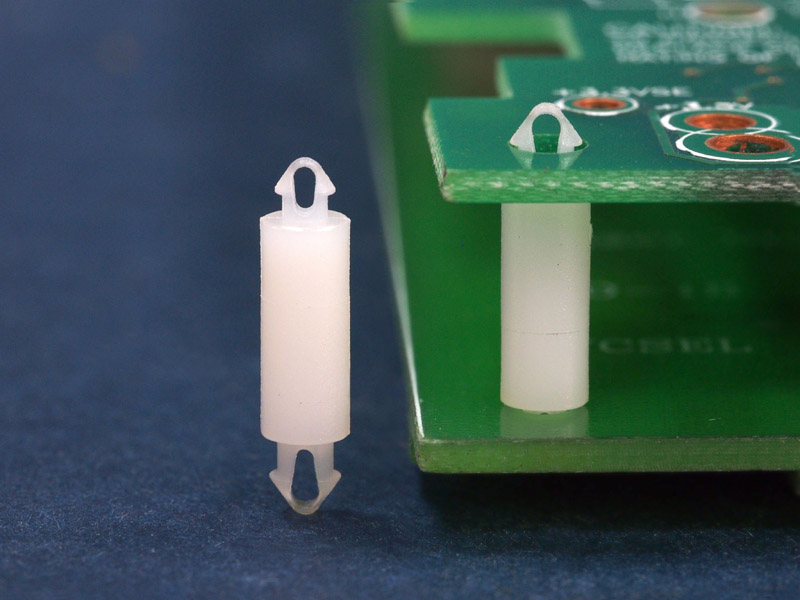 Dual locking support post. Snap lock teardrop design allows fixation into small holes. Top hole 2 mm. Bottom hole 2.5 mm. Length 7 mm.