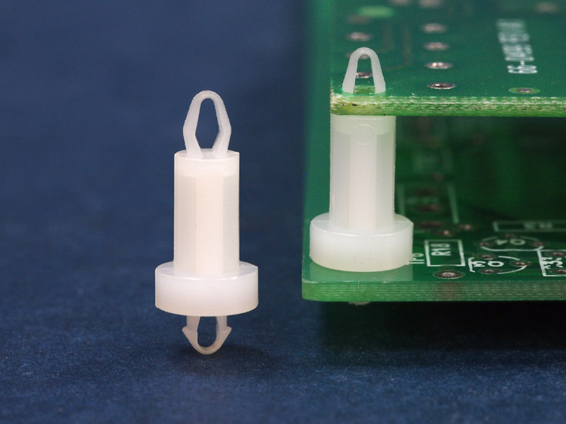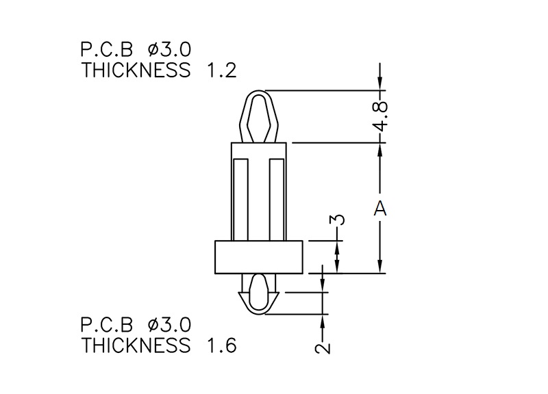 Dual locking support post with extended shoulder on one side for extra support. 3mm snap fit top hole and 3 mm snap lock bottom hole. Standoff height 12 mm.
