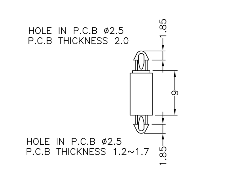 Dual locking support post. Snap lock teardrop design allows fixation into small holes. Top and bottom hole 2.5 mm. Spacer length 9 mm.