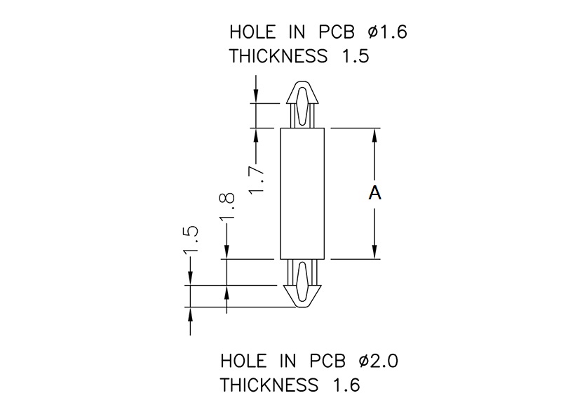 Dual locking support post. Snap lock teardrop design allows fixation into small holes. Top hole 1.6 mm. Bottom hole 2 mm. Length 9 mm.