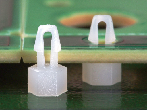 Push spacer hexagonal rest support provided with a snap lock for a 1.5 mm mounting hole. Standoff height 2 mm.