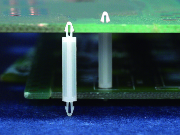 Dual locking support post. Snap lock teardrop design allows fixation into small holes. Top hole 1.5 mm. Bottom hole 1.5 mm. Length 14 mm.