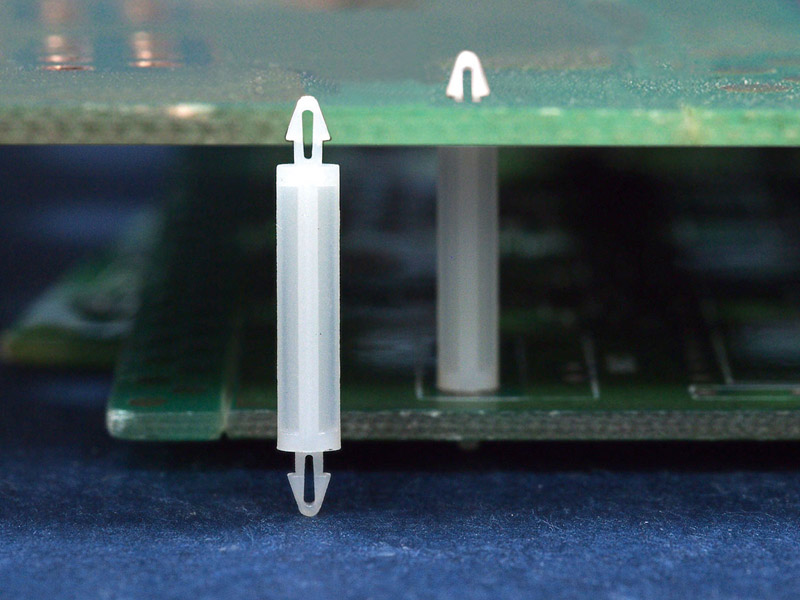 Dual locking support post. Snap lock teardrop design allows fixation into small holes. Top hole 1.5 mm. Bottom hole 1.5 mm. Length 18 mm.