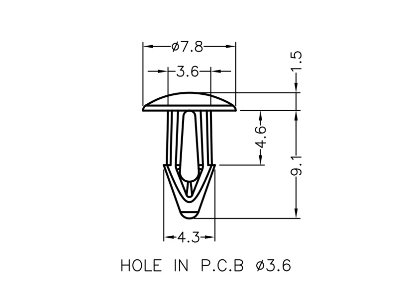 Push Mount Rivet. Material Nylon 66. Mounting hole dia Ø 3.6mm. Color Natural/Black. This Mounting Button has a locking arrowhead which can be released from the PCB underside