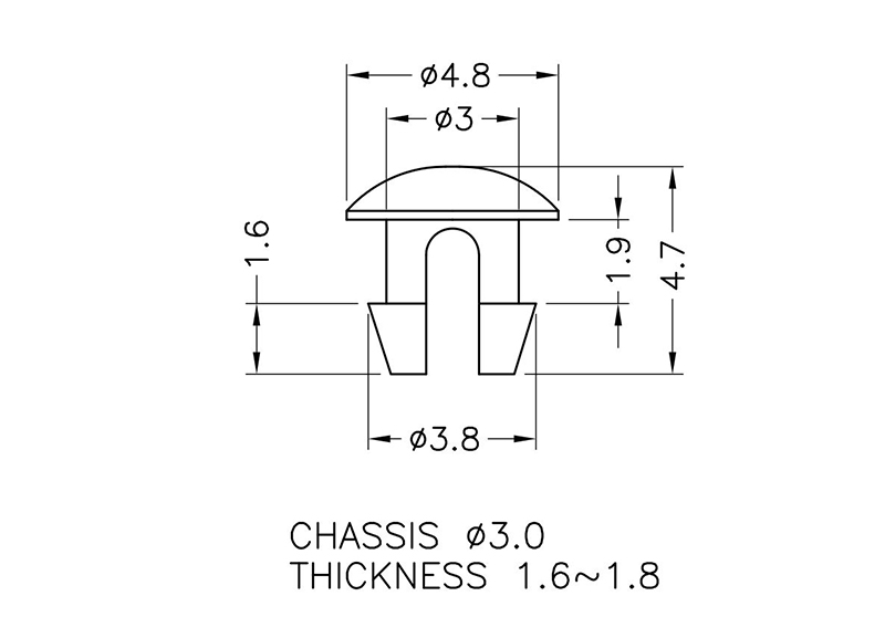 Snap Lock Pin. Mounting Hole dia. Ø 3.0mm. Panel Thickness 1`.6-1.8mm. Material Nylon 66. Color Natural/Black. Suitable as push-fit panel fastener