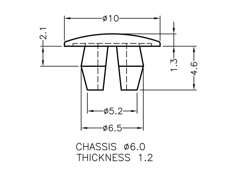 Push Mount Hole Plug. Mounting Hole Dia. Ø6.0mm. Panel Thickness 1.2mm. Material Nylon 66. Color Natural/Black.