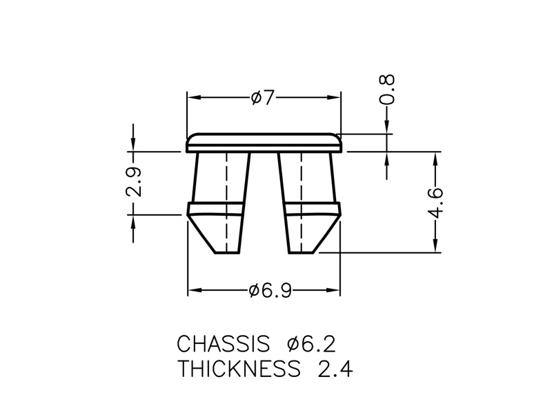 Push Mount Hole Plug. Mounting Hole Dia. Ø6.2mm. Panel Thickness 2.4mm. Material Nylon 66. Color Natural/Black.