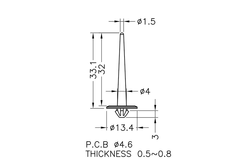 Spacer Pillar Support Rest Snap Lock. Height 33.1mm. Mounting hole dia. Ø4.6mm. Thickness 0.6mm. Material Polycarbonate (PC). Color Natural/Transparent. Supports LCD panels with high light-guiding efficiency, reflectivity, and light transmittance.