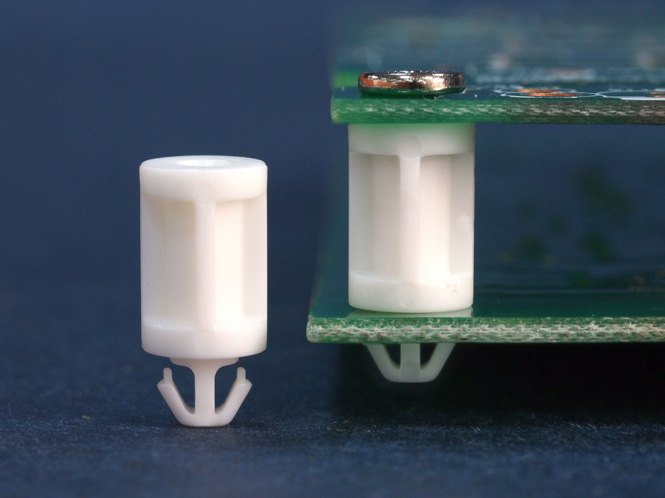 Snap lock spacer with a pilot hole of 2.4 mm and an arrowhead for an elongated chassis hole of 4.8 x 3.2 mm. Spacer length is 12 mm.