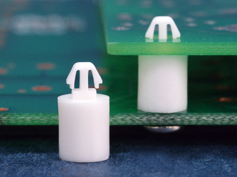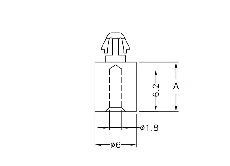 Snap lock hexagonal self tapping spacer with a pilot hole of 1.8 mm and an arrowhead for a rectangular mounting hole of 3 x 2 mm. Standoff height is 7.2 mm.