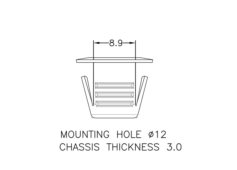 Hole Plug with Mounting hole Ø12.0mm. Chassis Thickness 3.0. This plug allows mounting of suitable blindhole fasteners inside the plug.