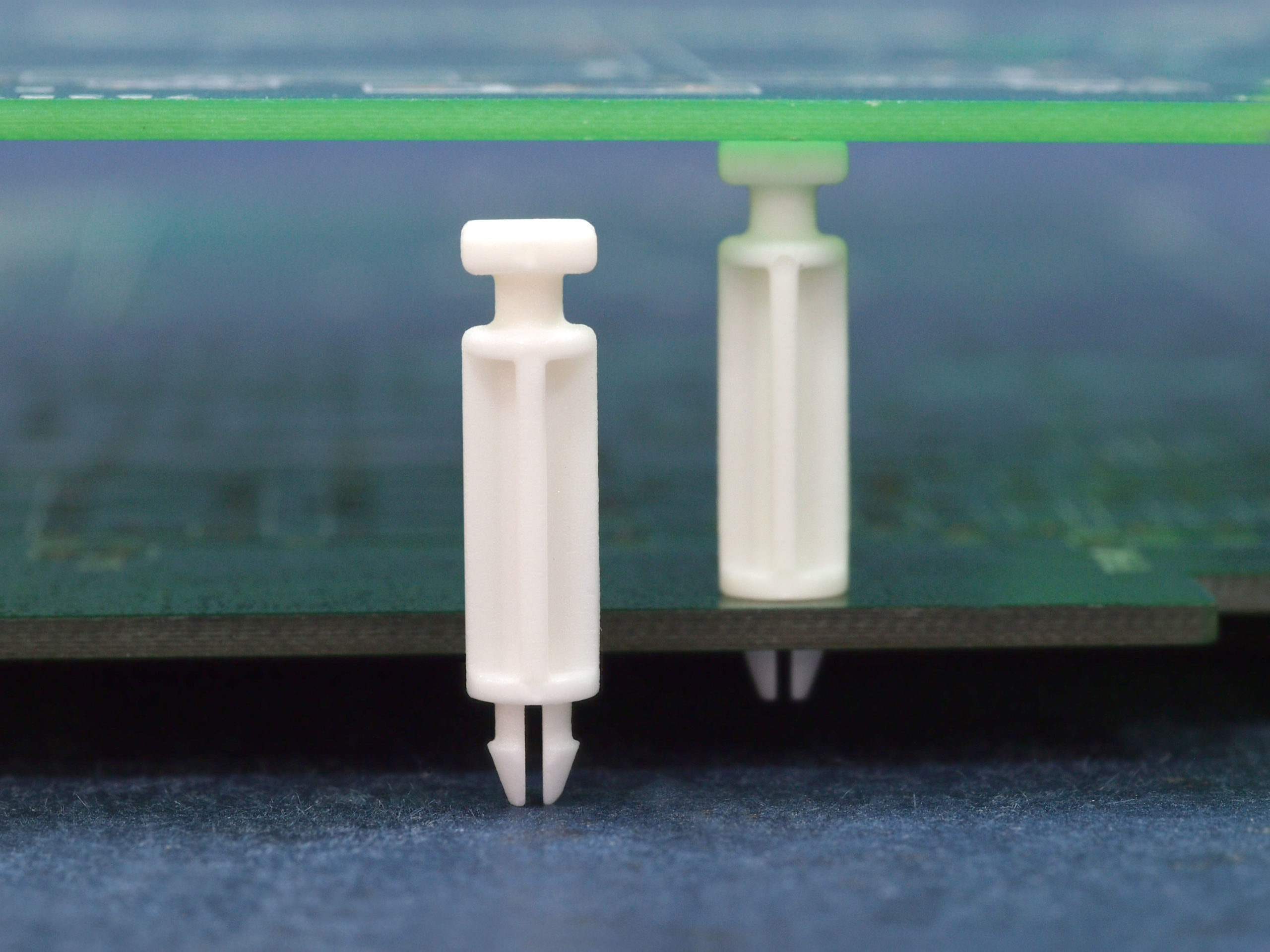 Push spacer rest support provided with a two prong snap lock for a 3 mm mounting hole. Spacer length 14.1 mm.